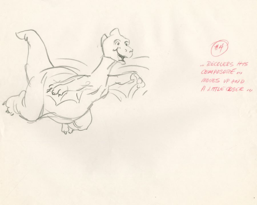 A development drawing from the Hanna Barbera Studios animated series "Godzilla" (1978-1979). Featuring a delightful illustration of Godzooky flying, the graphite drawing was created at the studio and used during the animation process. Measuring 10.5"x12.5" overall, with the character image measuring 5"x7", the drawing is in very good condition with dimpling throughout, minor page discoloration, and edge wear along the top.